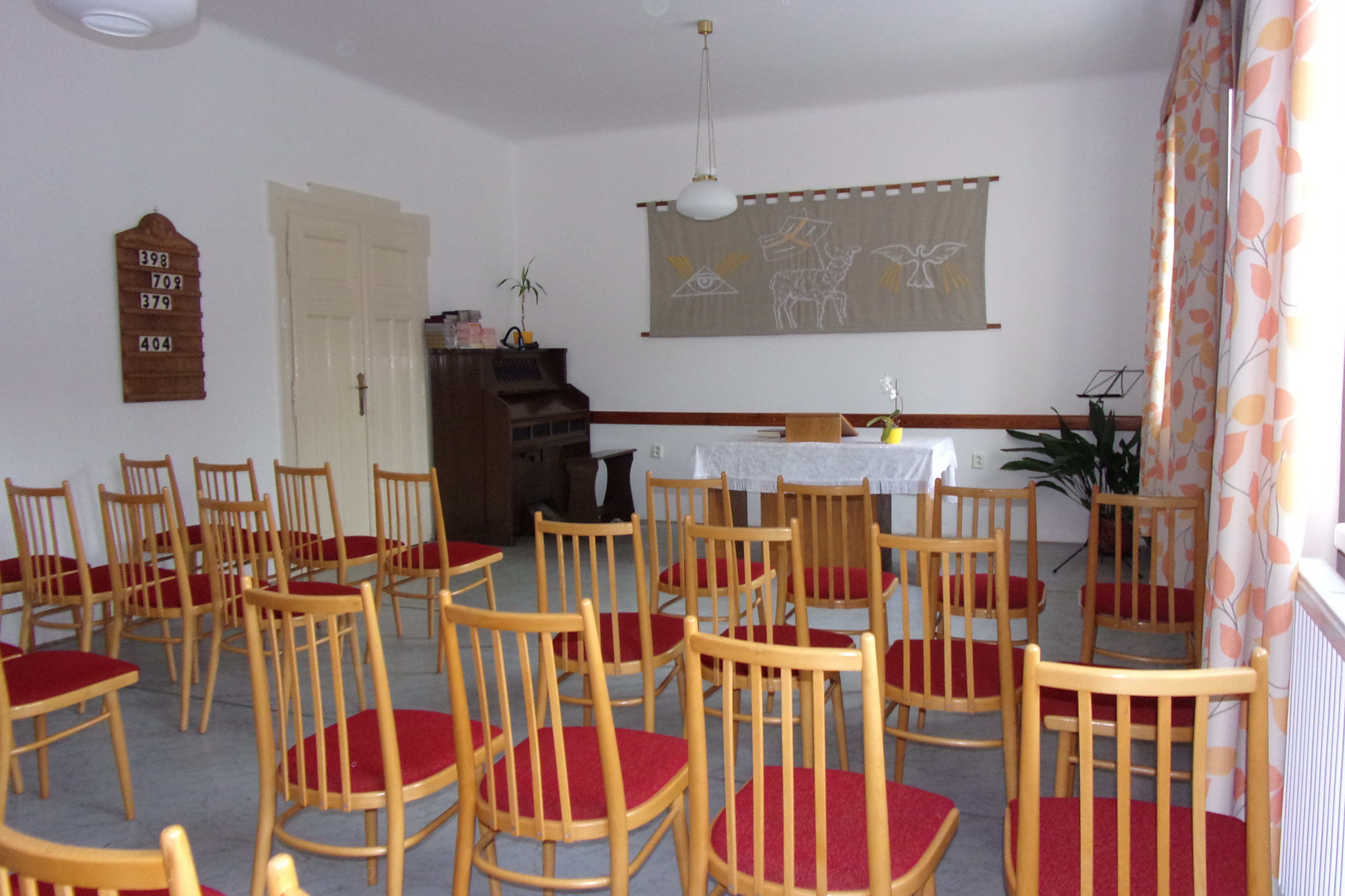 Od neděle 21.1. zkoušíme nové uspořádání modlitebny. Účastníci bohoslužeb nyní sedí v opačném směru. Díky tomu bylo možné uspořádat židle symetricky po čtyřech s uličkou uprostřed. Vzniklo tím 41 míst k sezení místo původních 34. Původně byly řady po šestí židlích na jedné straně a po dvou židlích na druhé... Účastníci bohoslužeb mohou vyjádřit svůj názor na uspořádání modlitebny prostřednictvím anketních lístků.
