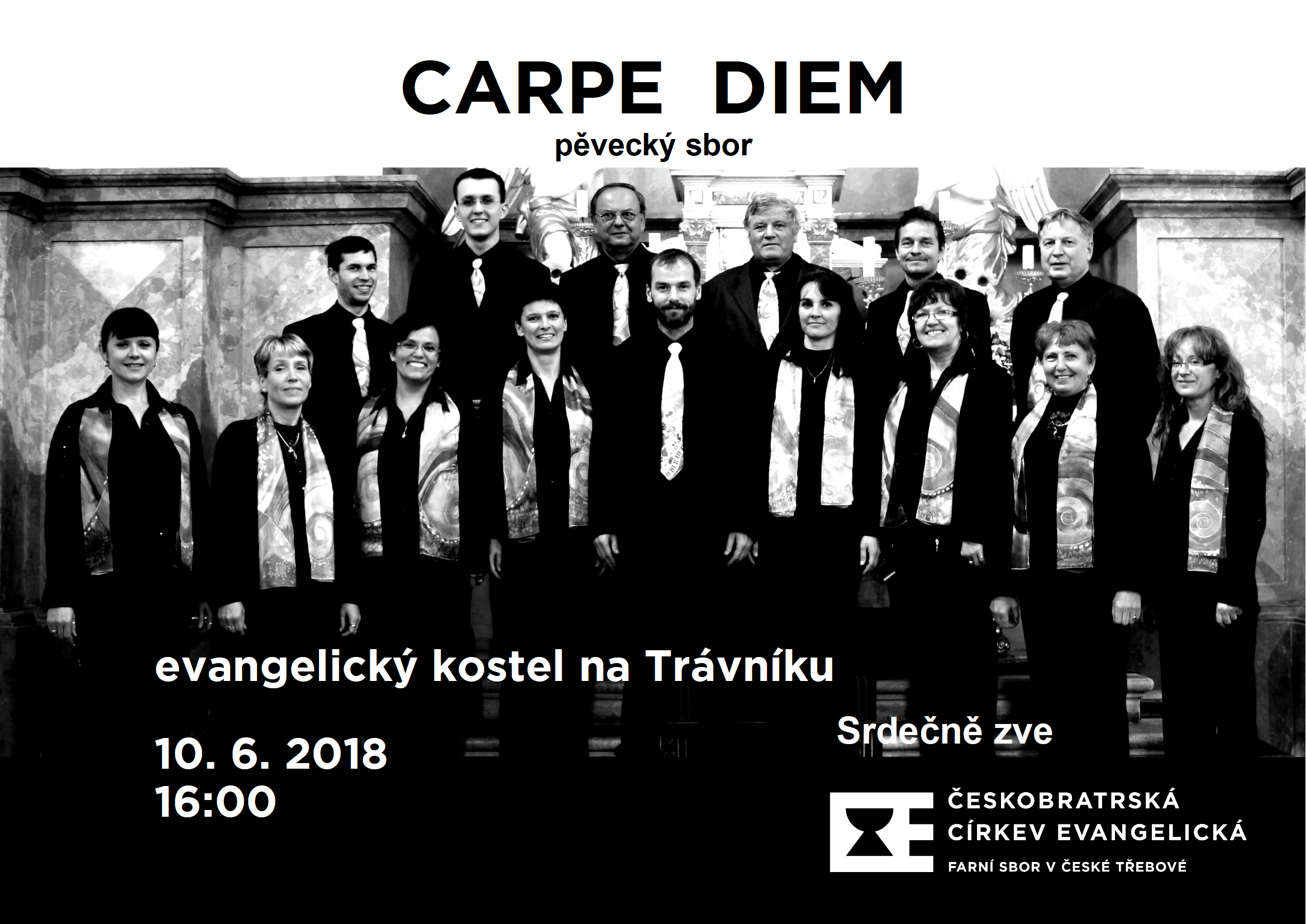 Srdečně Vás zveme na vystoupení komorního smíšeného pěveckého sboru CARPE DIEM z Letovic - v neděli10. června od 16 h v evangelickém kostele na Trávníku. Soubor má široký repertoár od renesančních a barokních písní, přes skladby klasicismu a romantismu až k moderní hudbě jako jsou spirituály nebo jazz. Nechybí ani lidová píseň. A to vše je podáváno ve vícehlasých provedeních a s úsměvem na rtech. Řídí sbormistr Karel Pecháček. Vstupné dobrovolné.