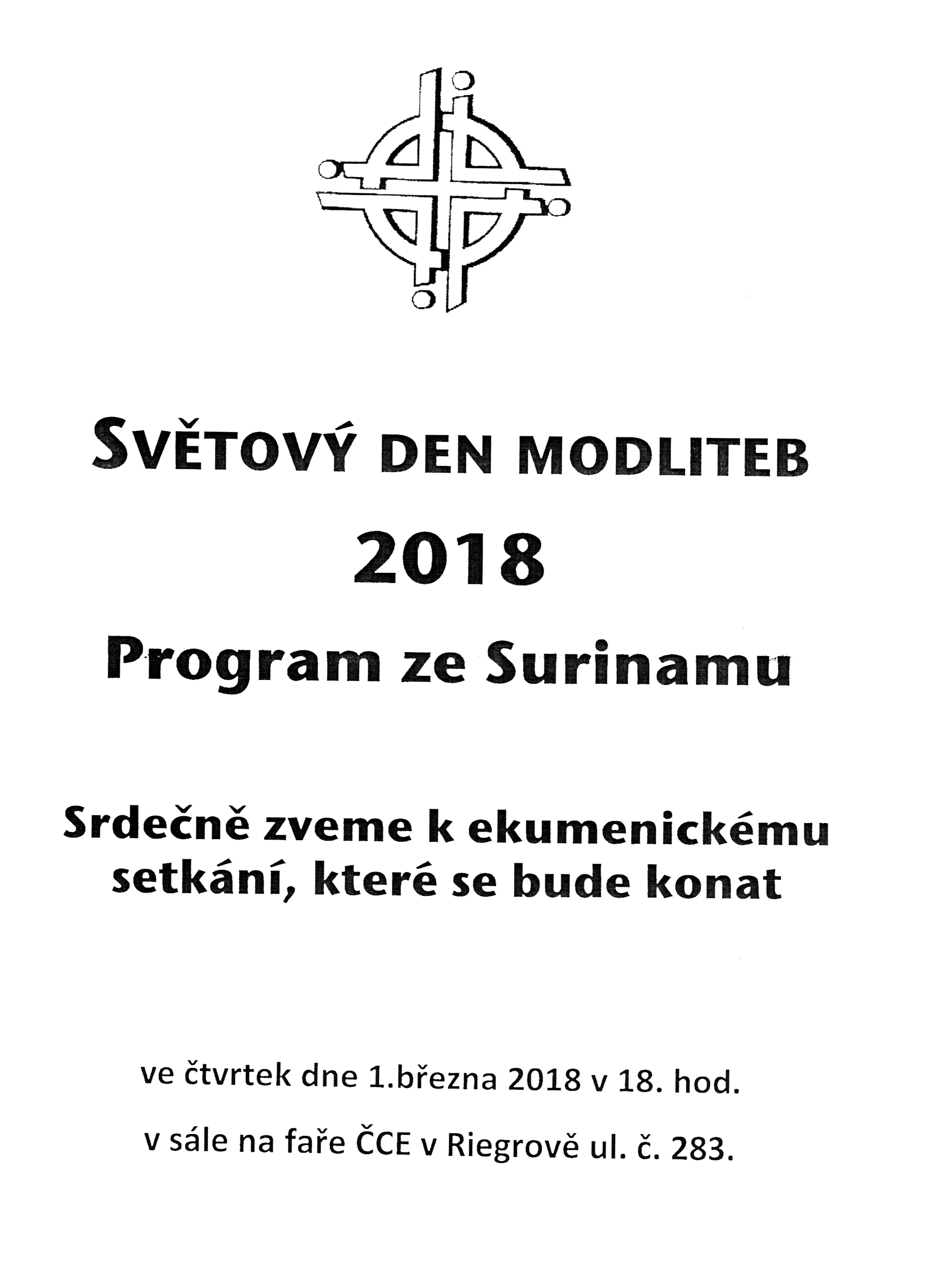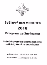Evangelický sbor v České Třebové Vás srdečně zve na každoroční setkání s názvem Světový den modliteb, které se koná ve čtvrtek 1. března v 18 h na evangelické faře - ulice Riegrova 283. Ekumenickou bohoslužbu připravily křesťanské ženy z jihoamerického státu Surinam a povede ji Věra Nečasová s dalšími ženami z různých českotřebovských církví. Součástí bohoslužby je i uvedení do důležitých rysů a problémů této - jinak patrně většině Čechů neznámé - země. Co je posláním této akce?