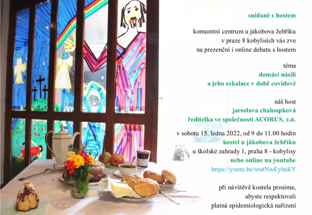 Milé sestry a bratři. Komunitní centrum U Jákobova žebříku v Praze 8 Kobylisích Vás zve na debatu s ředitelkou společnosti Acorus Jaroslavou Chaloupkovou. Debatovat budeme na téma "Domácí násilí a jeho eskalace v době covidové". Pozvánku najdete v příloze a budeme moc rádi, když ji předáte svým kamarádům a známým. Snídaně je otevřená všem, rádi Vás přivítáme buď u nás v kostele v Praze 8 Kobylisích, nebo Vás vzdálenější ONLINE na YouTube, kde můžete také klást písemné dotazy. Snídaně s hostem Jaroslavou Chaloupkovou KDY: v sobotu 15. ledna 2022 V KOLIK: od 9 do 11 hodin KDE: v Kostele U Jákobova žebříku, Praha 8, Kobylisy, U Školské zahrady 1 NEBO TÉŽ přenášená ONLINE zde: https://youtu.be/wutNwEyhukY Přineste si, jak je naším zvykem, něco k snídani, nebo snídejte doma v klidu u počítače. V kostele se společně o jídlo rozdělíme, káva, čaj a mléko budou k dispozici. Při návštěvě kostela prosíme, abyste respektovali platná epidemiologická nařízení. Ve vzdálených sborech se můžete třeba sejít a snídat a sledovat debatu společně online. Těšíme se na vás, ať už v kostele nebo online. Jitka Boučková Komunitní centrum U Jákobova žebříku